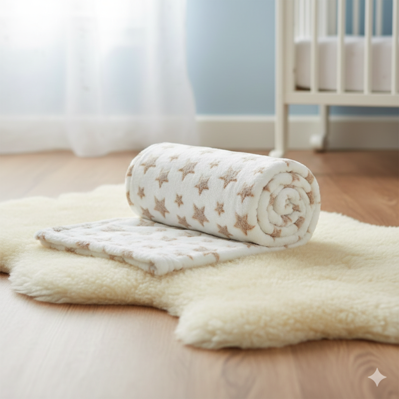Покривка за бебешко легло, изработена от висококачествен и мек полиестер в бял цвят с принт на бежови звезди.