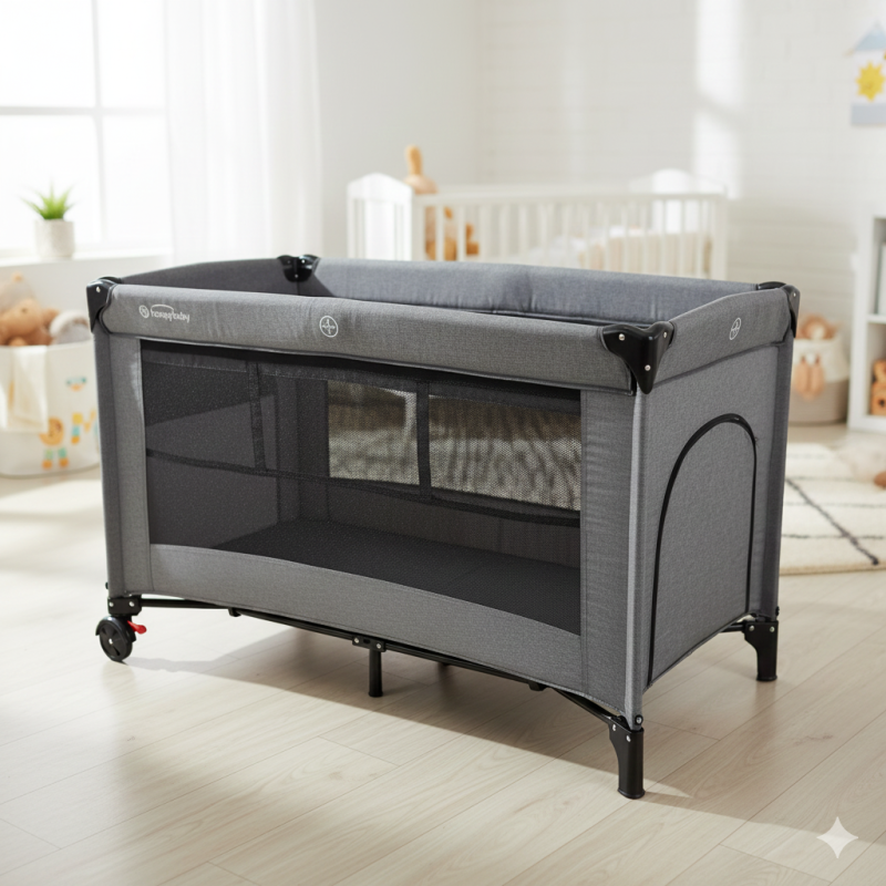 Голяма и стабилна бебешка кошара в сив цвят.