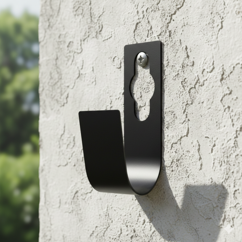 Практична стенна стойка за градински маркуч, изработена от метал в черен цвят, предназначена за градината, вилата, двора и всяко друго място, където се използва маркуч.