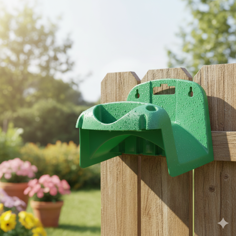 Удобна стенна поставка за градински маркуч, изработена от пластмаса в зелен цвят - перфектна за градината, вилата, двора и всяко друго място, където се използва маркуч.