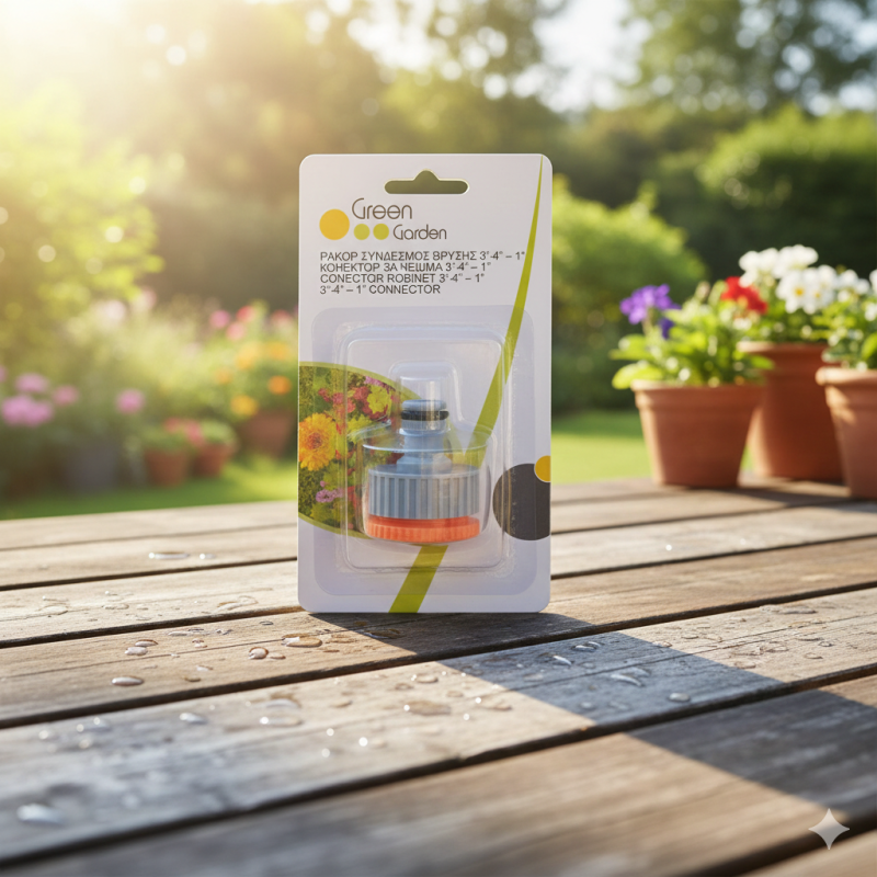 Конектор за свързване на градински маркуч към чешма, изработен от здрава пластмаса.