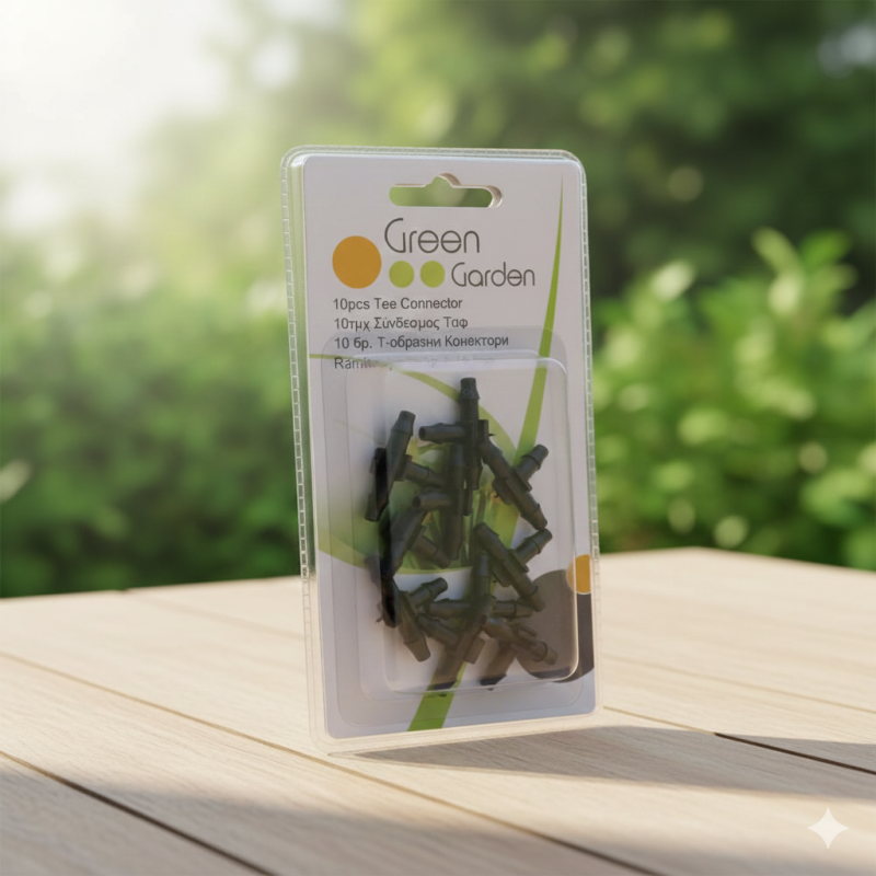 Комплект от 10 броя Т-образни конектори за свързване на водопроводящи тръби в системи за капково напояване.