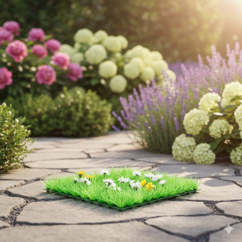 Плочка изкуствена трева с цветя с височина на стръкчетата 3 см. може да се използва за създаване на тревна площ, която не само не се нуждае от поддръжка, но и ще изглежда като истинска зелена ливада целогодишно.