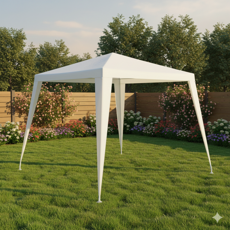 Градинска тента тип шатра без стени, изработена от здрава и устойчива материя в бял цвят.