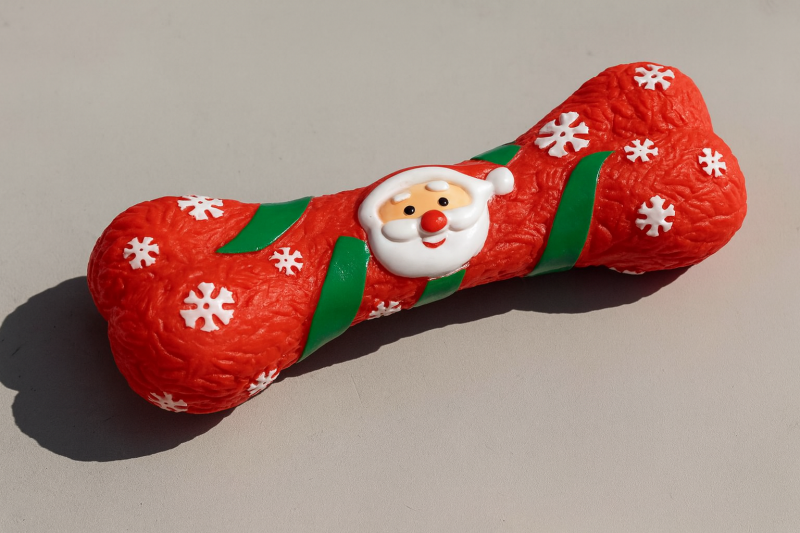 Коледна играчка за кучета във формата на кокал с изображение на Дядо Коледа и снежинки.