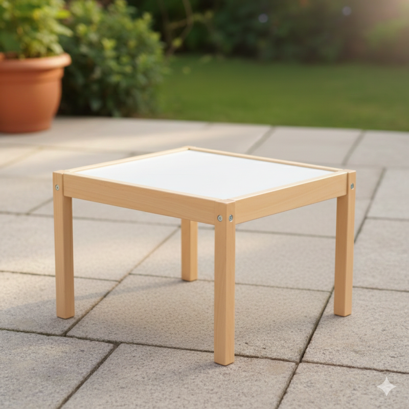 Универсална детска масичка, изработена от качествена дървесина в естествен цвят с бяла повърхност.