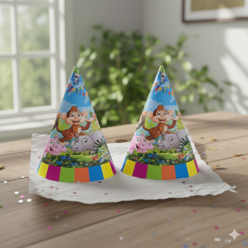 6 броя парти шапки с ластик, изработени от картон с картинка на животните от джунглата.