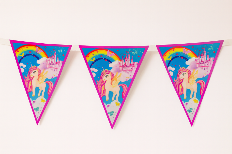 Парти гирлянд с 10 флагчета, изработен от хартия с цветни картинки на еднорог.