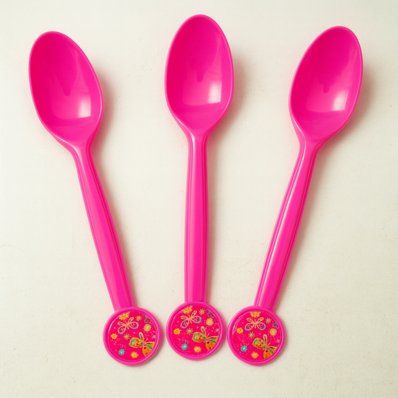 10 броя парти лъжички за еднократна употреба, изработени от пластмаса в розов цвят с картинка на пеперуди.