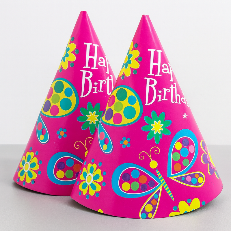 6 броя парти шапки с ластик, изработени от картон в розов цвят с картинка на пеперуди и надпис Happy Birthday.