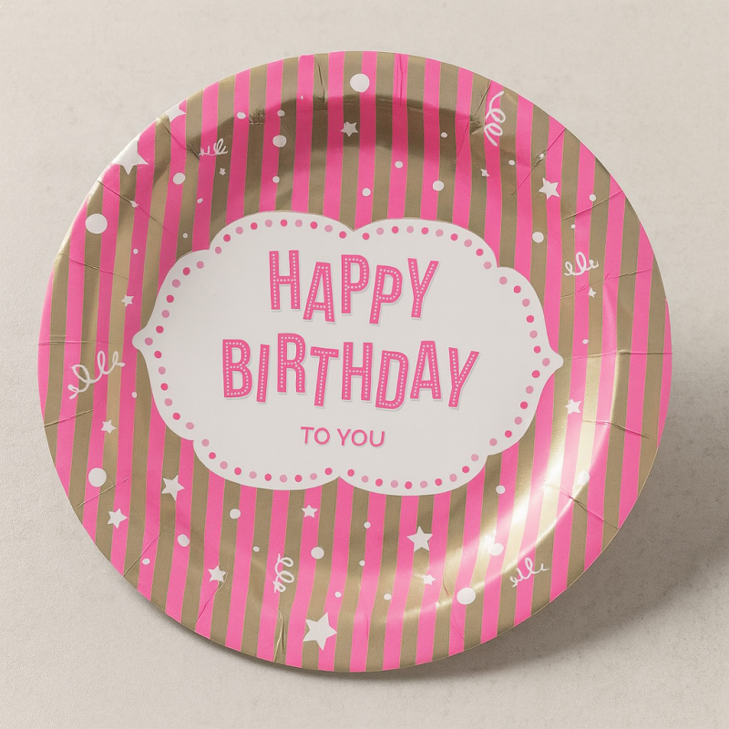Комплект от 6 броя парти чинии с кръгла форма, изработени от картон в златисто-розово райе с надпис Happy birthday.