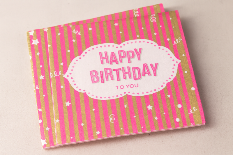 12 броя луксозни парти салфетки в златисто-розово райе с надпис Happy Birthday.