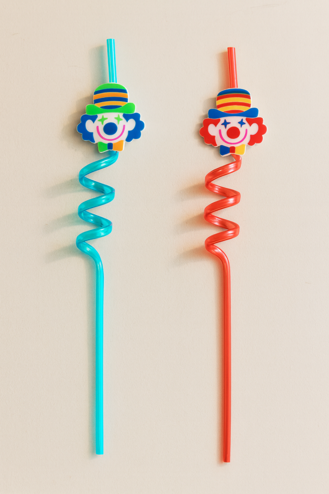Комплект от 2 броя спираловидни парти сламки, изработени от прозрачна пластмаса в червено и синьо с декоративни фигурки на клоуни.