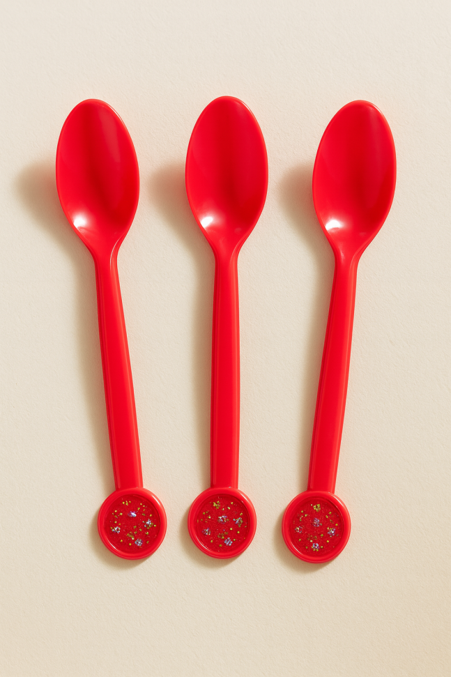 10 броя парти лъжички за еднократна употреба, изработени от пластмаса в червен цвят с картинка на клоун.