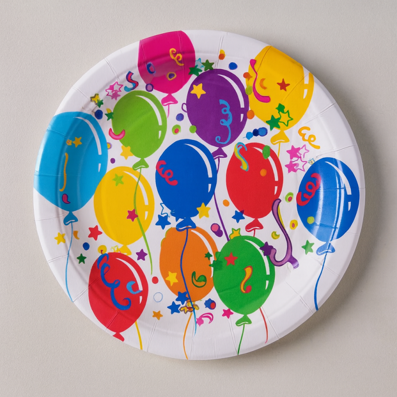 10 броя парти чинии с кръгла форма, изработени от картон в бял цвят с принт на разноцветни балони и конфети.