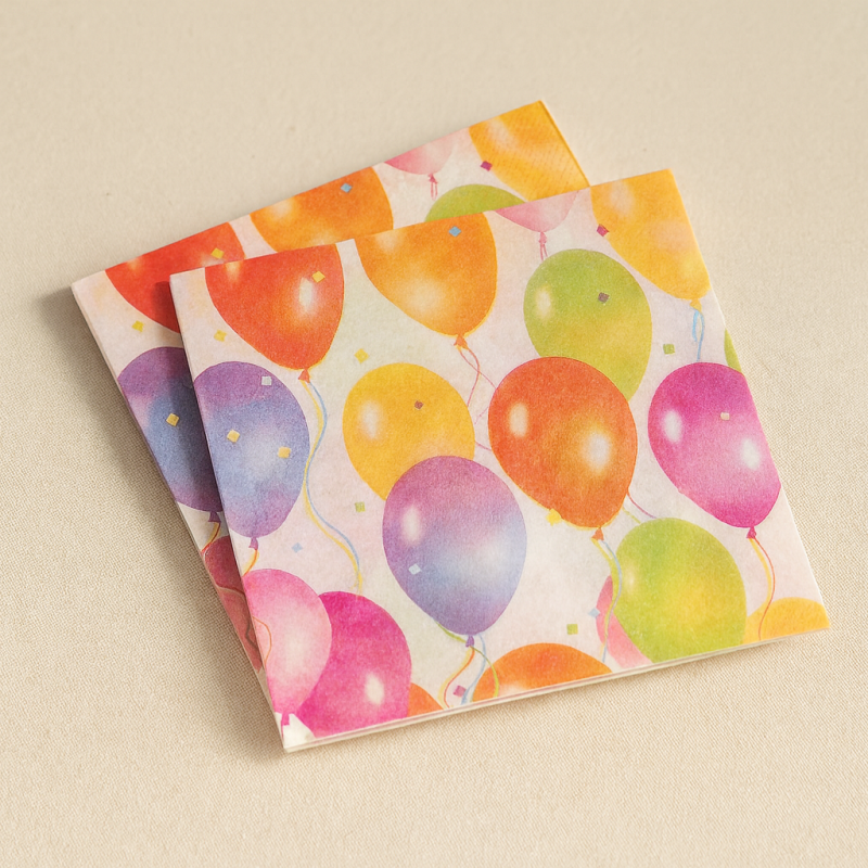 Икономична опаковка от 100 броя луксозни двупластови парти салфетки в бял цвят с принт на разноцветни балони.