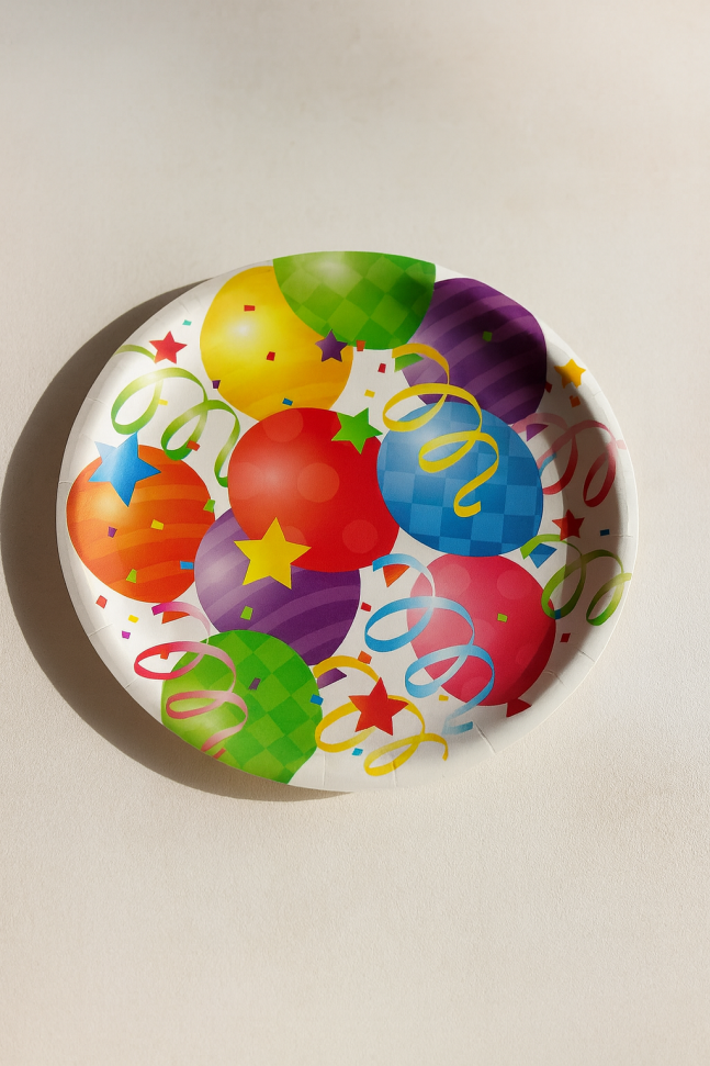 Голяма парти чиния с кръгла форма, изработена от картон в бял цвят с щампа на многоцветни балони и конфети.