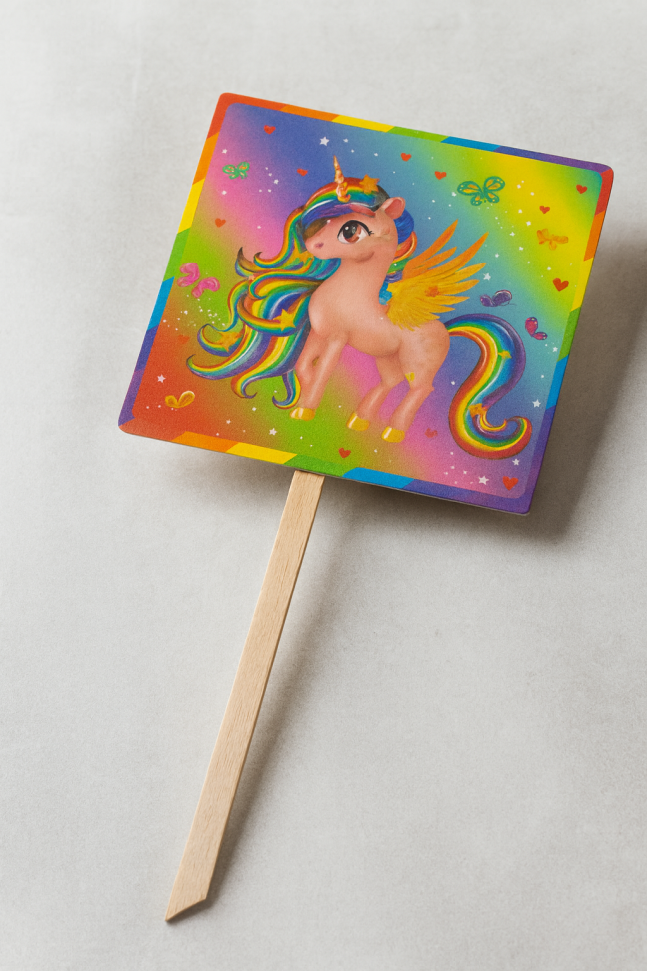 Парти декоративна табела с квадратна форма и цветна картинка еднорог, изработена от дърво и хартия.