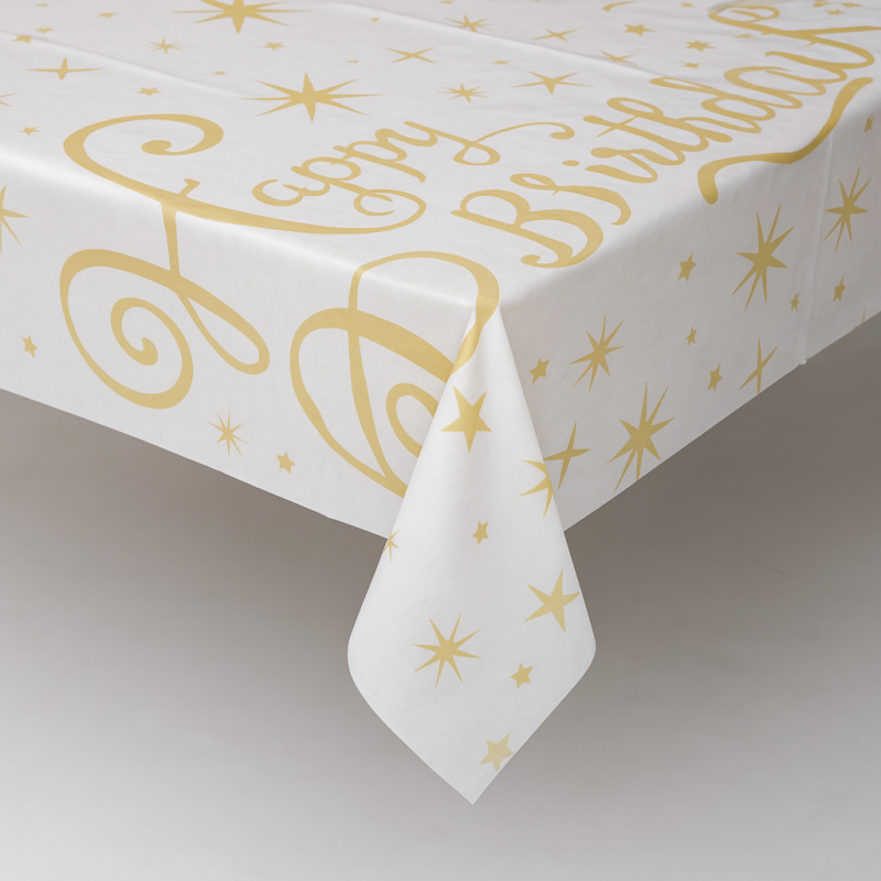 Парти мушама за маса, изработена от безвредни материали в бял цвят със златисти звезди и надпис Happy Birthday.