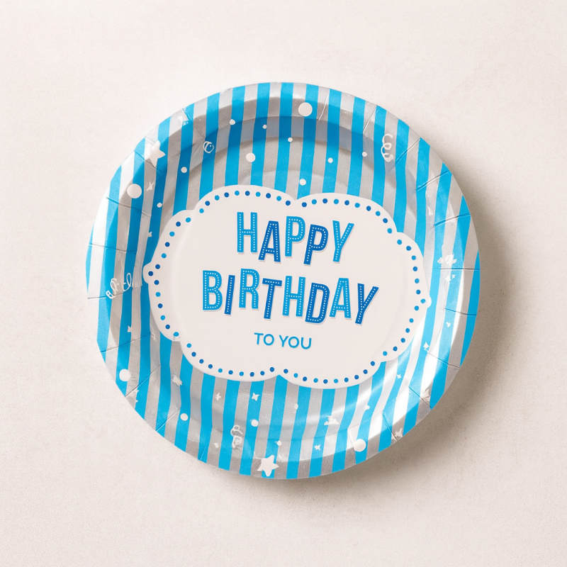 6 броя парти чинии с кръгла форма, изработени от картон в синьо-бяло райе с надпис Happy Birthday.
