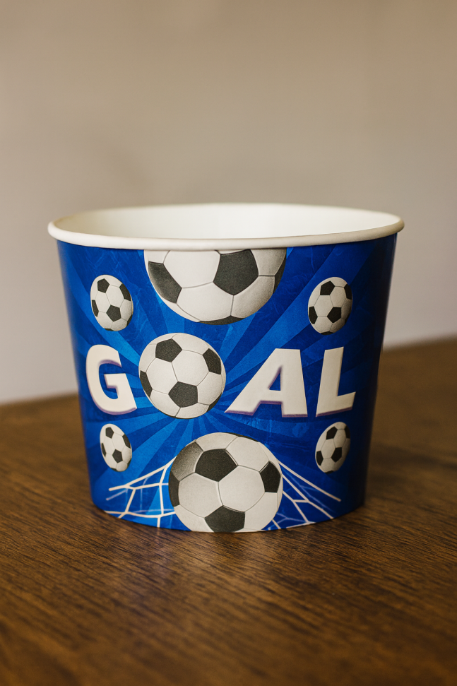 Голяма парти купа, изработена от картон в син цвят с картинки на футболни топки и надпис Goal.