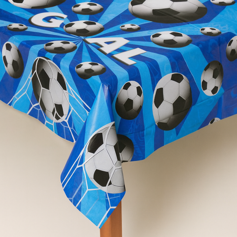Парти мушама за маса за еднократна употреба, изработена от пластмаса в син цвят с принт на футболни топки и надпис Goal.