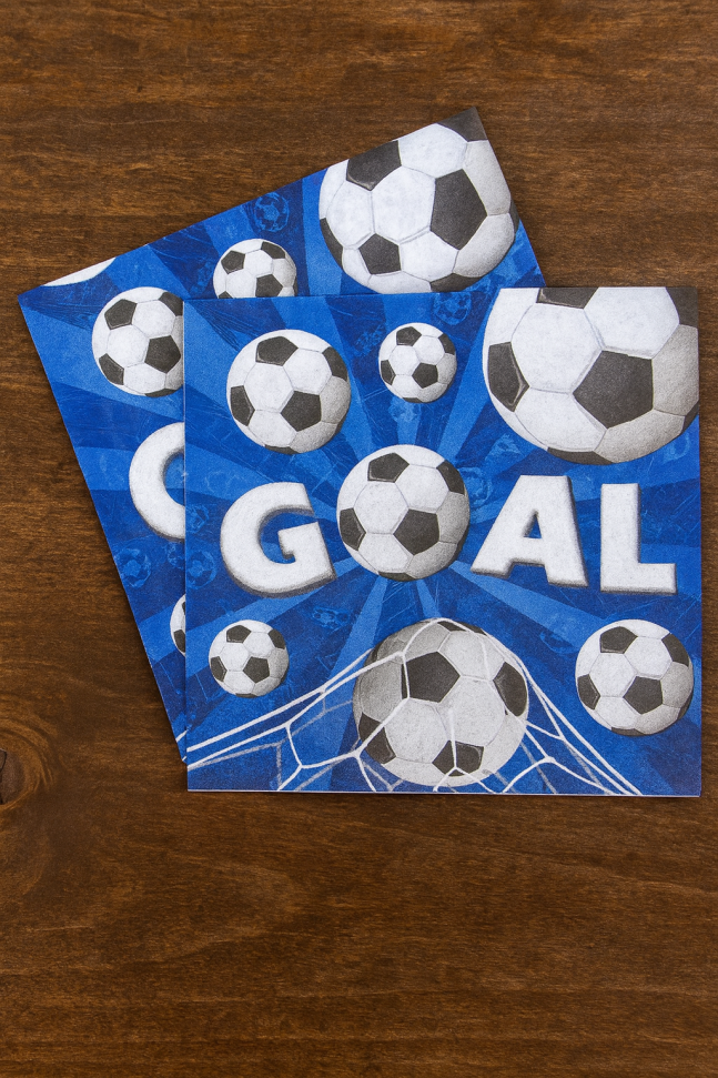 20 броя луксозни двупластови парти салфетки в син цвят с принт на футболни топки и надпис Goal.
