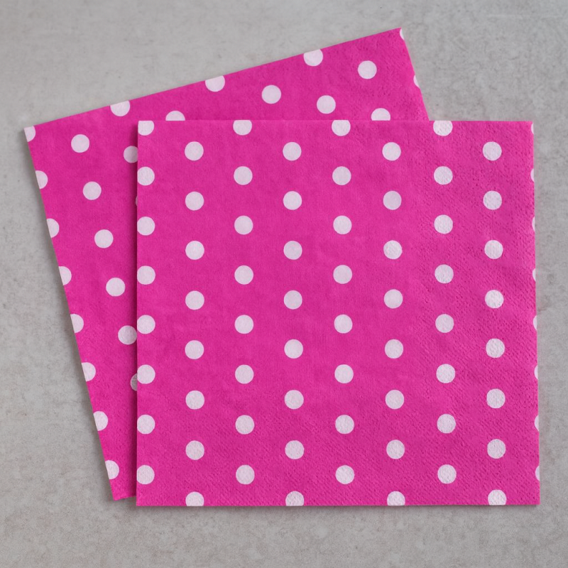 20 броя луксозни двупластови парти салфетки в цикламен цвят с бели точки.