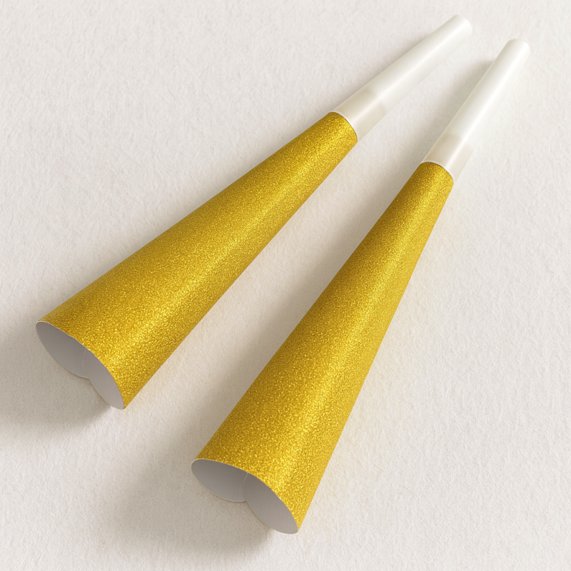 6 броя парти свирки, изработени от пластмаса и хартия със златисти брокатени частици.