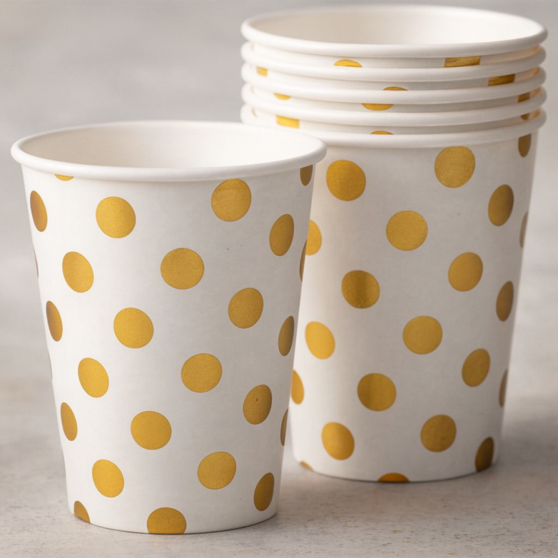 6 броя парти чаши за еднократна употреба, изработени от картон в бял цвят със златисти точки.