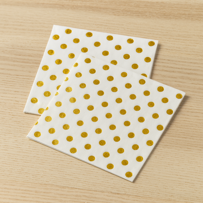 12 броя луксозни двупластови парти салфетки в бял цвят със златисти точки.