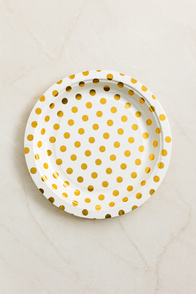 6 броя парти чинии с кръгла форма, изработени от картон в бял цвят със златисти точки.