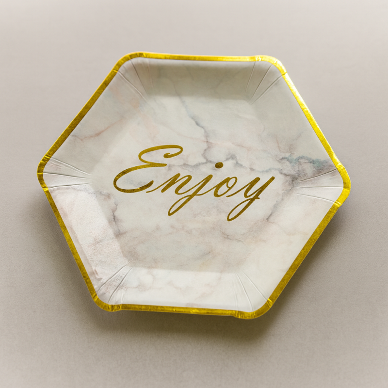 6 броя парти чинии с шестоъгълна форма, изработени от картон с мрааморен десен и надпис Enjoy.
