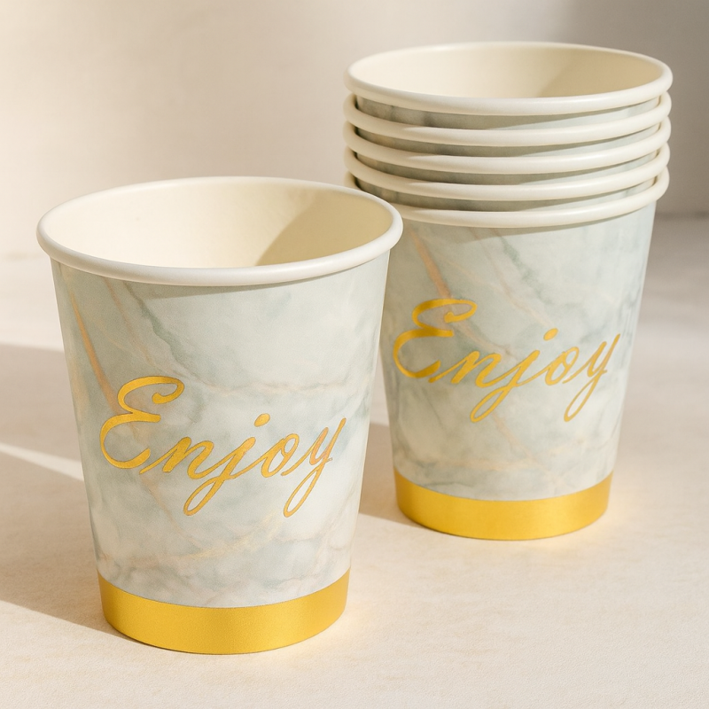 6 броя парти чаши за еднократна употреба, изработени от картон в мраморен десен със златист надпис Enjoy.