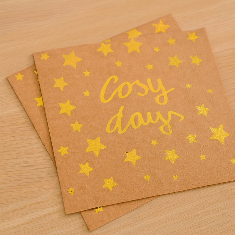 12 броя луксозни двупластови парти салфетки в кафяв цвят със златисти звезди и надпис.