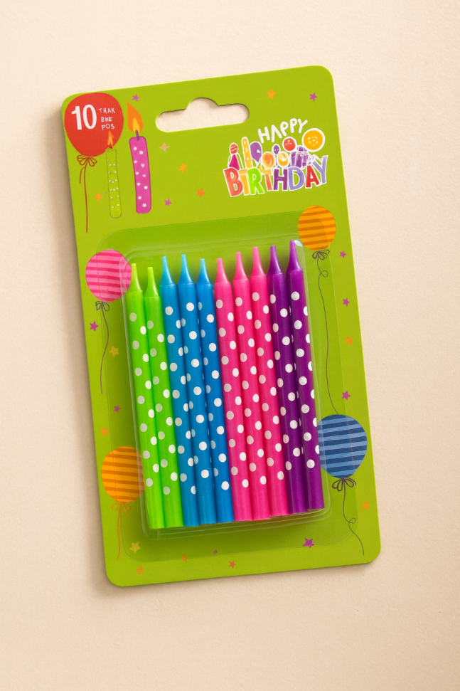 10 броя празнични свещи за торта в 4 ярки цвята - зелено, синьо, розово и лилаво на бели точки, които ще бъдат колоритно допълнение към всяко парти за рожден ден.