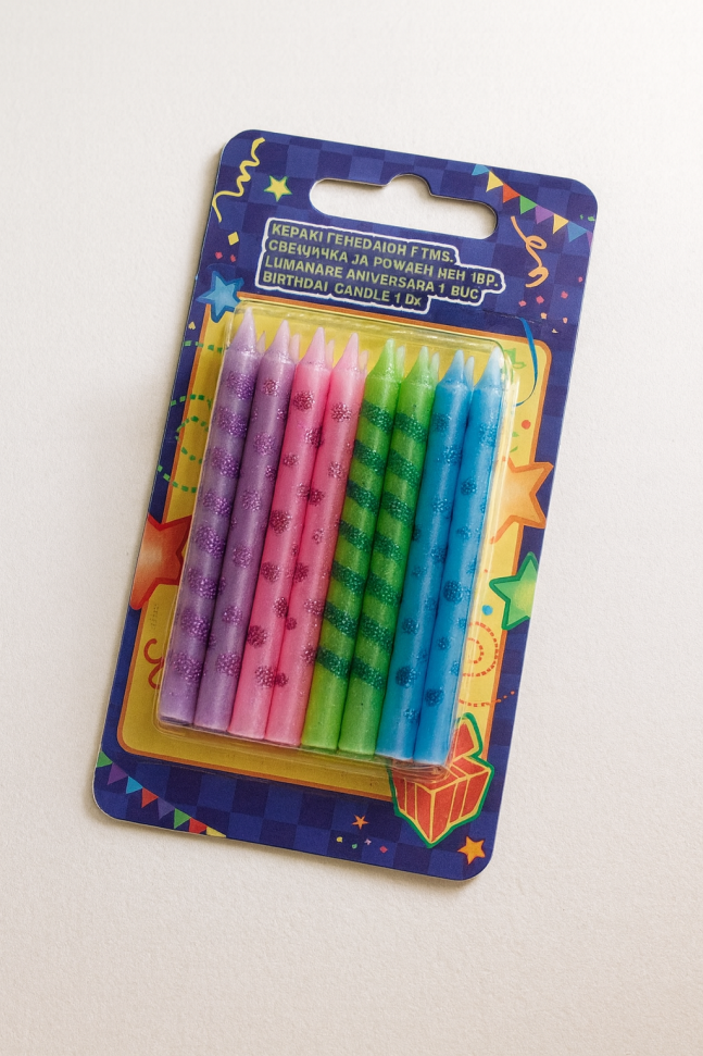 24 броя празнични свещи за торта в 4 ярки цвята - зелено, синьо, розово и лилаво с блестящи брокатени частици, които ще бъдат колоритно допълнение към всяко парти за рожден ден.