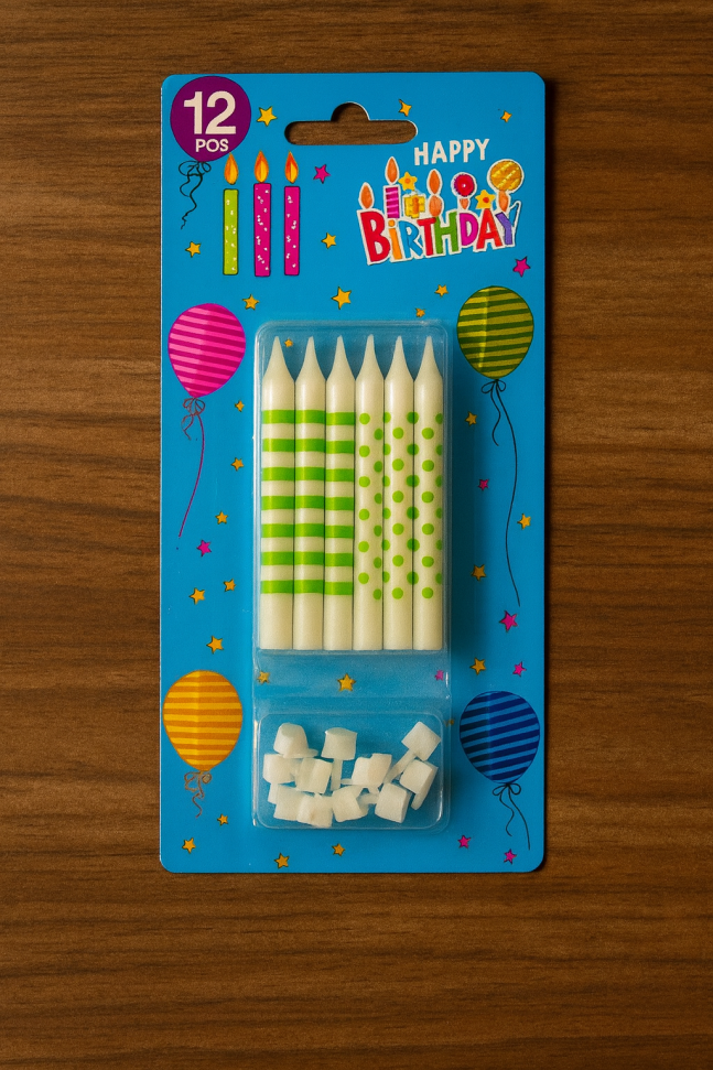 12 броя празнични свещи с поставки за торта в зелено-бели шарки, които ще бъдат идеално допълнение към всяко парти за рожден ден.