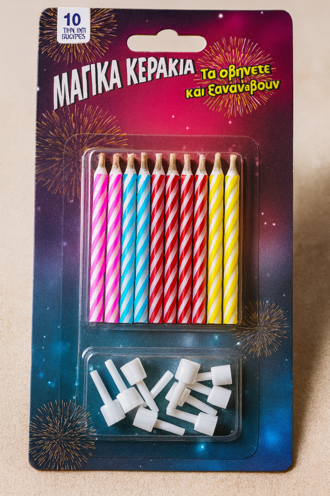 10 броя вълшебни свещи за торта в 4 ярки цвята - розово, синьо, червено и жълто, които премигват докато горят и ще допълнително настроение на всяко парти за рожден ден.
