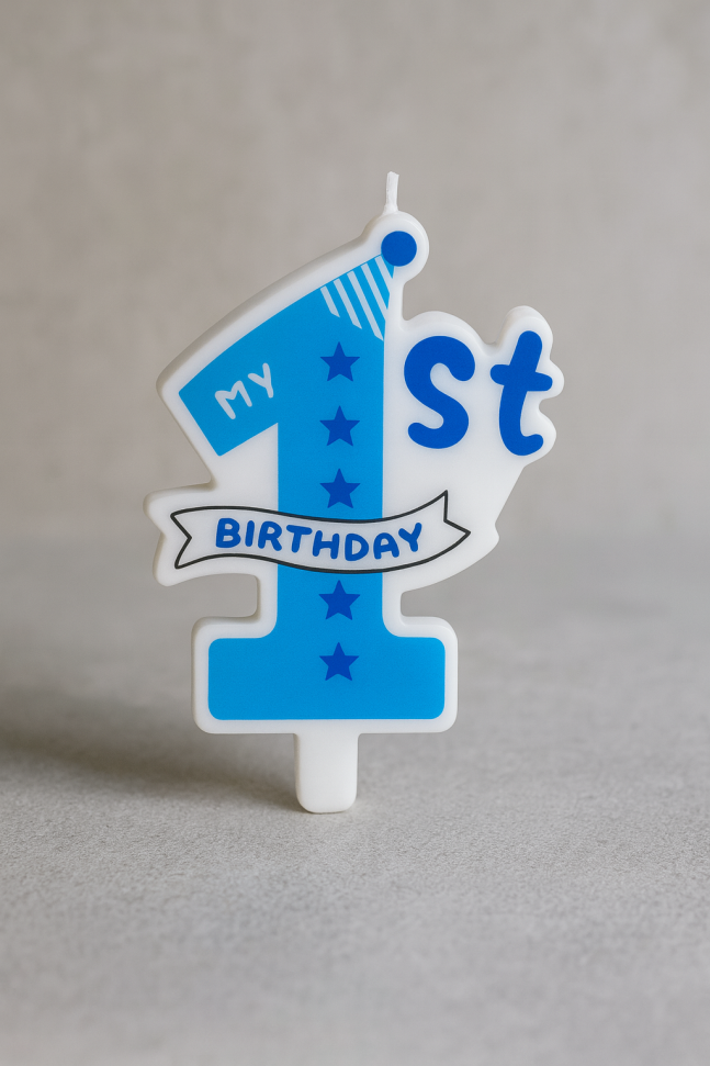 Празнична свещ за торта във формата на цифрата 1 в син цвят, която ще бъде атрактивно допълнение към всяко парти за първи рожден ден на дете.