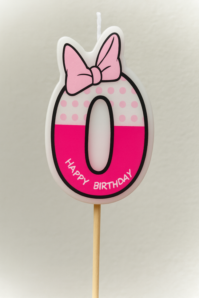 Празнична свещ за торта във формата на цифрата 0 в розово и бяло с панделка, която ще бъде красиво допълнение към всяко парти за рожден ден на дете.