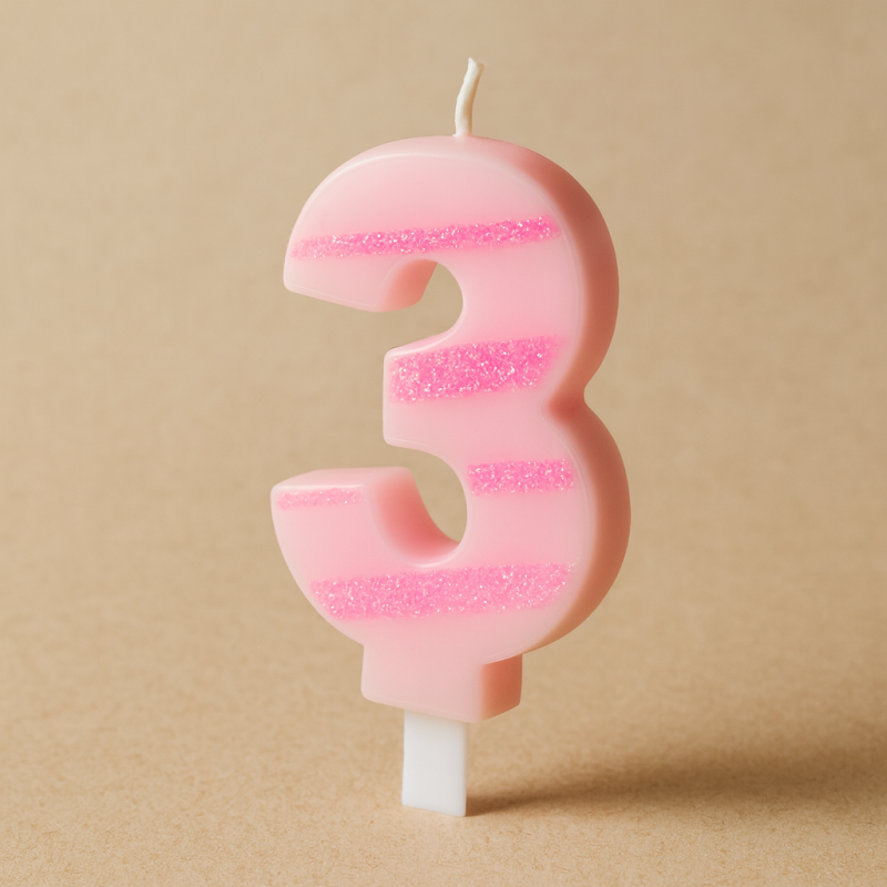 Празнична свещ за торта във формата на цифрата 3 в розово райе с блестящи частици брокат, която ще бъде ефектно допълнение към всяко парти за рожден ден на дете.