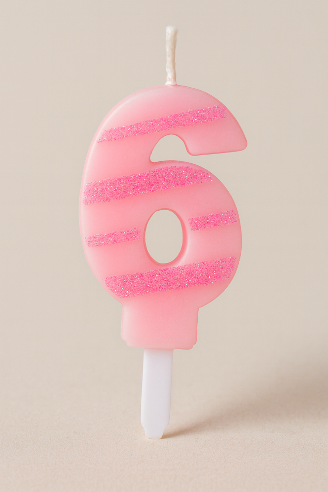 Празнична свещ за торта във формата на цифрата 6 в розово райе с блестящи частици брокат, която ще бъде красиво допълнение към всяко парти за рожден ден на дете.