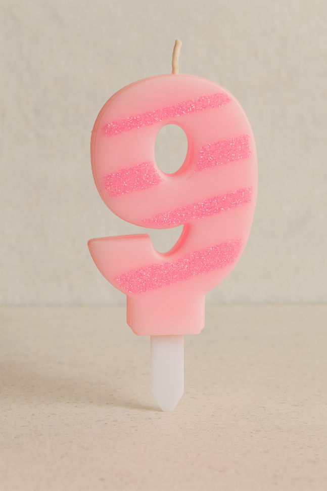 Празнична свещ за торта във формата на цифрата 9 в розово райе с блестящи частици брокат, която ще бъде ефектно допълнение към всяко парти за рожден ден на дете.