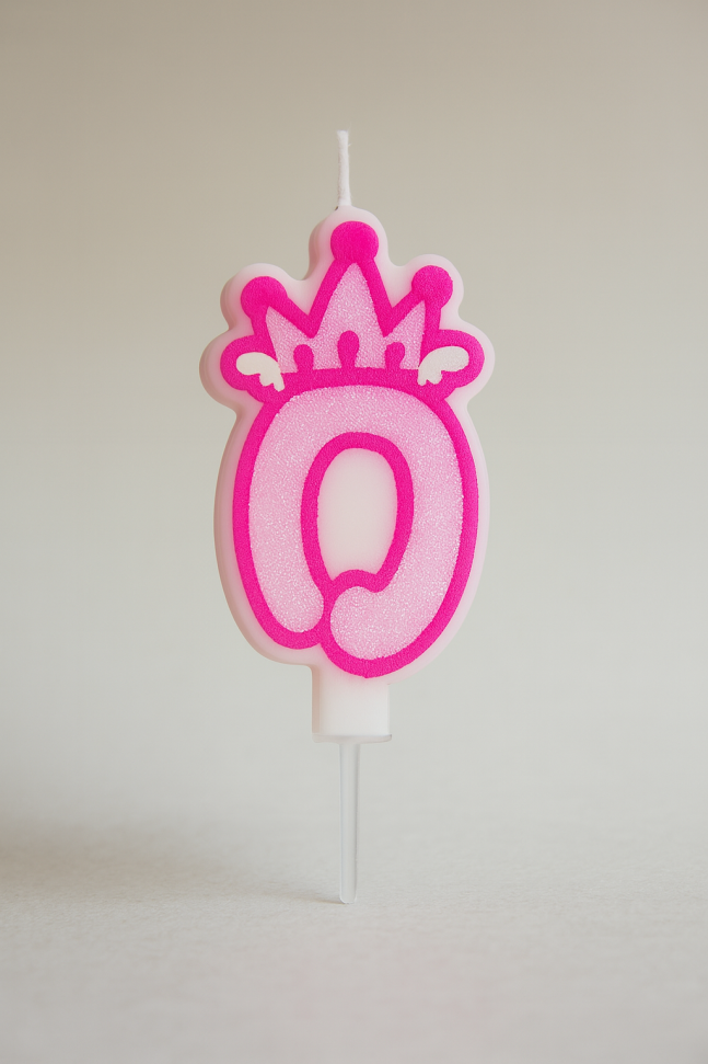 Празнична свещ с поставка за торта във формата на цифрата 0 в розови нюанси с корона, която ще бъде атрактивно допълнение към всяко парти за рожден ден на дете.