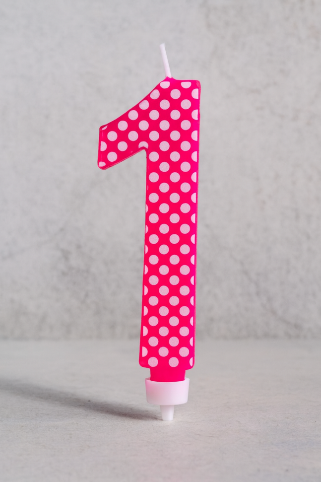 Голяма празнична свещ с поставка за торта във формата на цифрата 1 в розов цвят с бели точки, която ще бъде колоритно допълнение към всяко парти за първи рожден ден на дете.