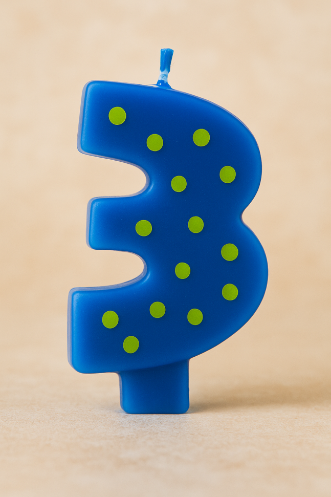 Празнична свещ за торта във формата на цифрата 3 в син цвят със зелени точки, която ще бъде чудесно допълнение към всяко парти за рожден ден на дете.