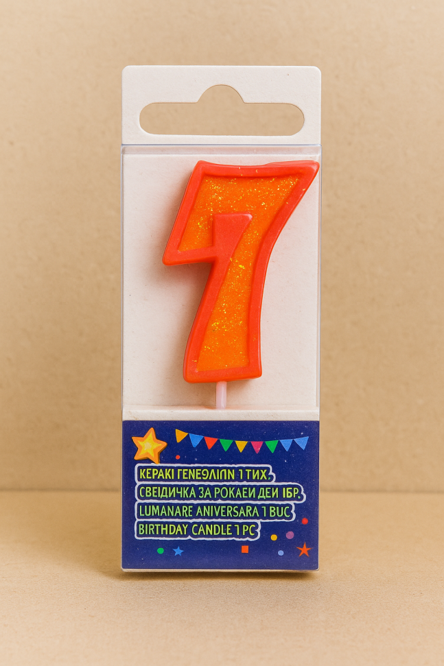 Празнична свещ за торта във формата на цифрата 7 в оранжев цвят с блестящи частици брокат, която ще бъде атрактивно допълнение към всяко парти за рожден ден на дете.