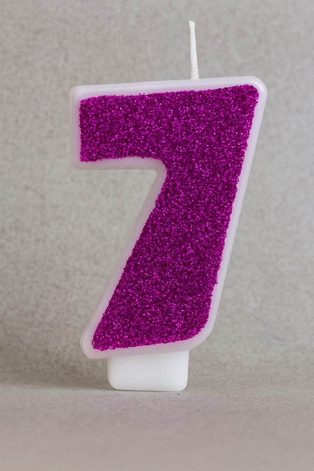 Празнична свещ за торта във формата на цифрата 7 в лилав цвят с блестящи частици брокат, която ще бъде перфектно допълнение към всяко парти за рожден ден на дете.