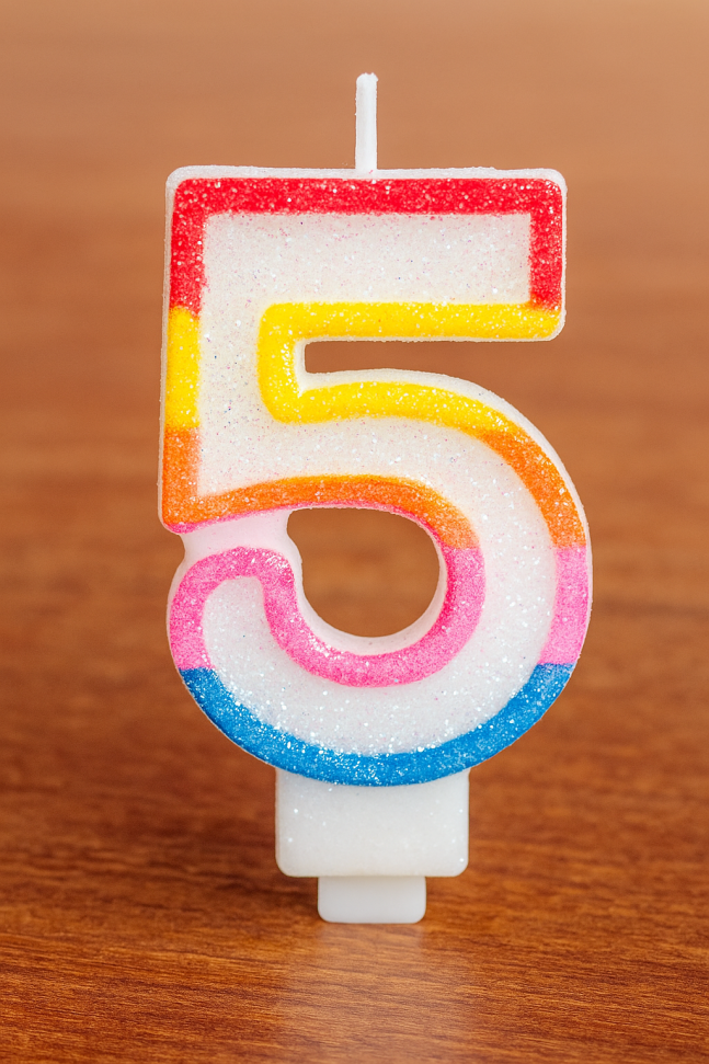 Празнична свещ за торта във формата на цифрата 5 в бял цвят с разноцветна рамка и блестящи частици брокат, която ще бъде чудесно допълнение към всяко парти за рожден ден на дете.